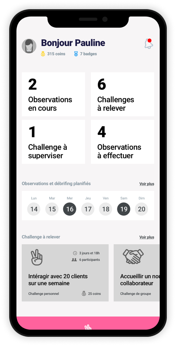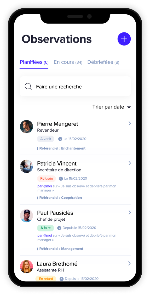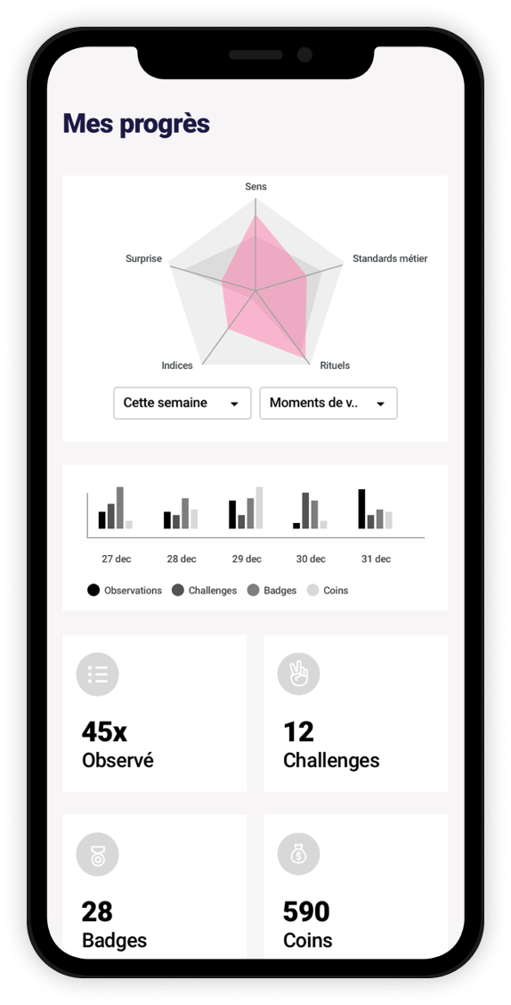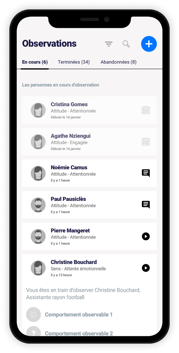 Les typologies d’utilisateurs sont diverses : équipes terrains, opérationnels et manager, chacun pouvant observer et se faire observer dans un cadre précis. Au total 90 écrans ont été testé dans différents parcours.