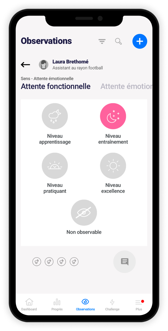L’expérience proposée devait aussi répondre à la méthode de l’Académie, tout en proposant les codes plus spécifiques d’une application mobile : statistiques personnels, d’équipes, défis, gratification…