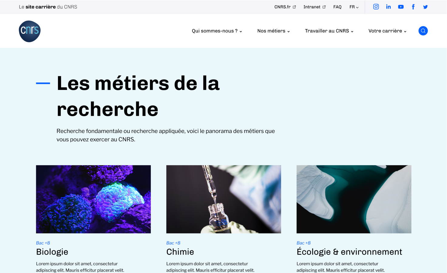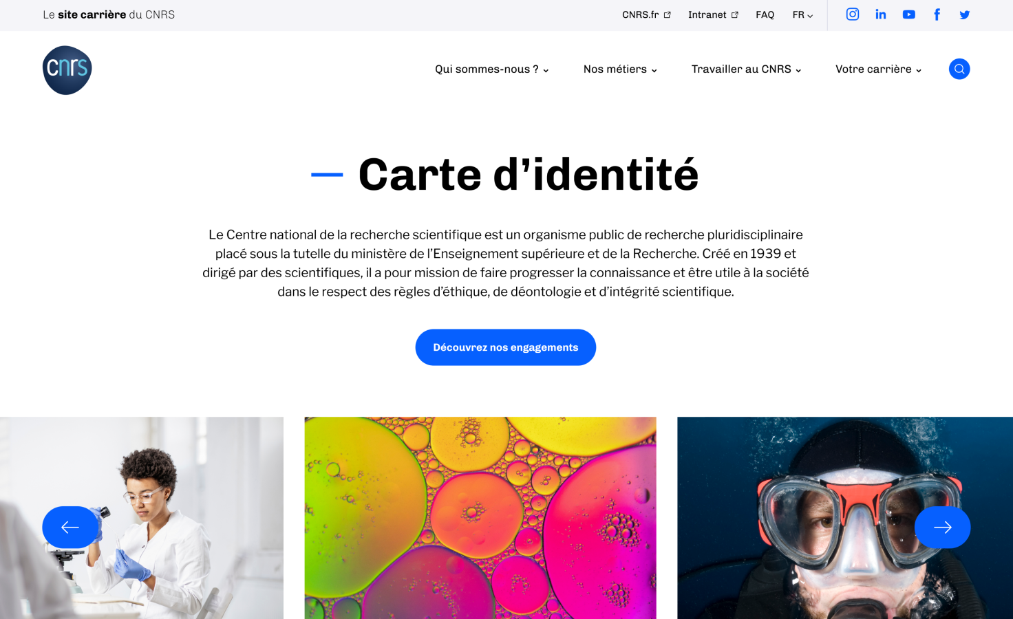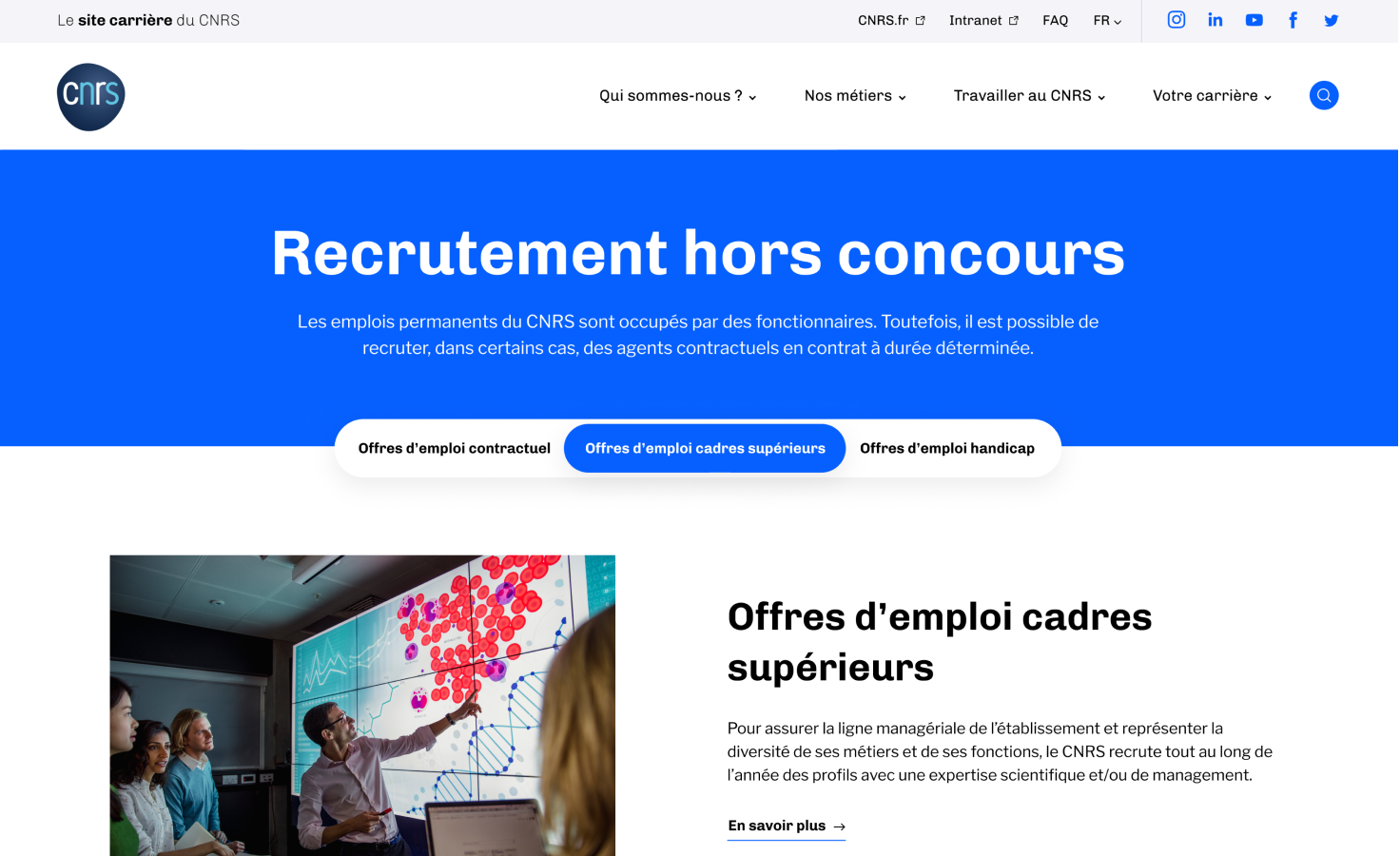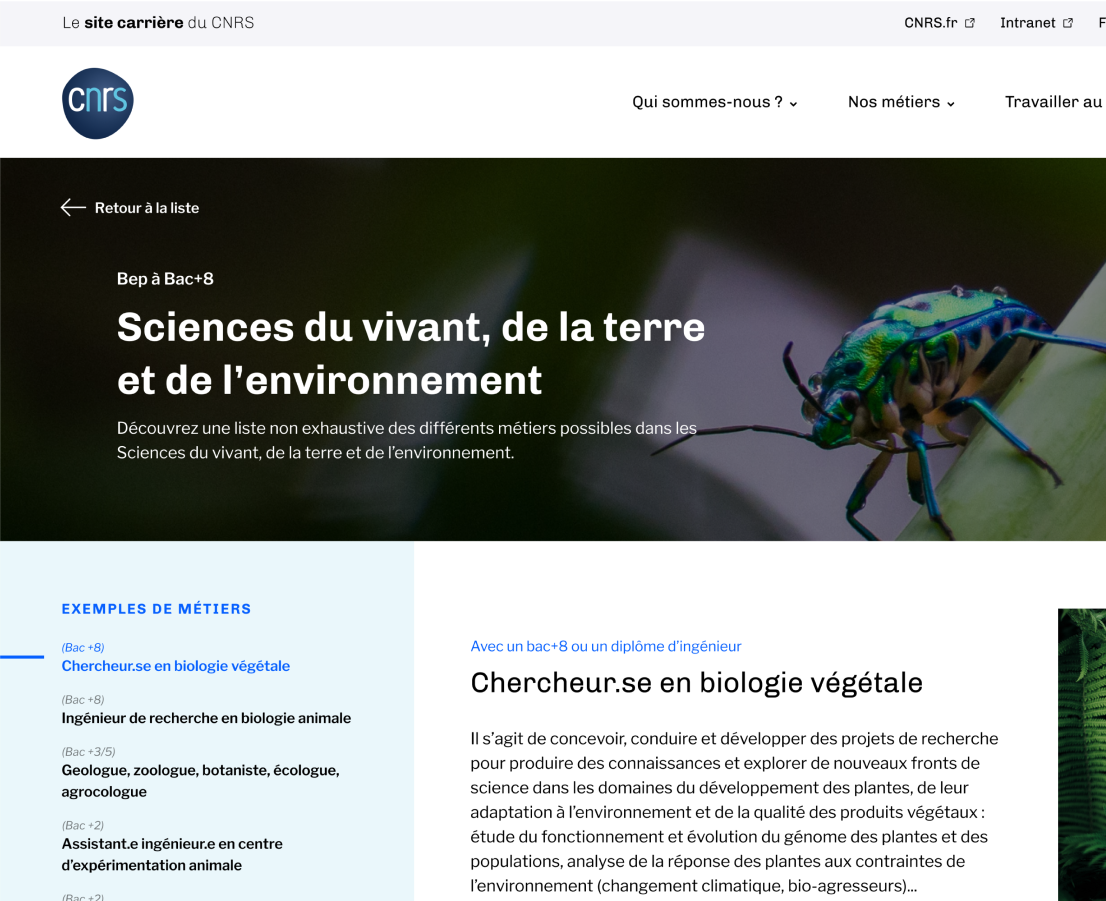Une attention particulière a été accordée à la création de nouveaux contenus centrés sur les utilisateurs. Parmi ces contenus figurent des pages métiers détaillées, fournissant une vue d’ensemble des différents domaines de recherche. Des témoignages vidéos authentiques ont également été intégrés pour offrir un aperçu concret des expériences professionnelles au sein du CNRS. Nous avons également décidé de mettre à disposition des grilles de salaire pour offrir une transparence aux candidats.