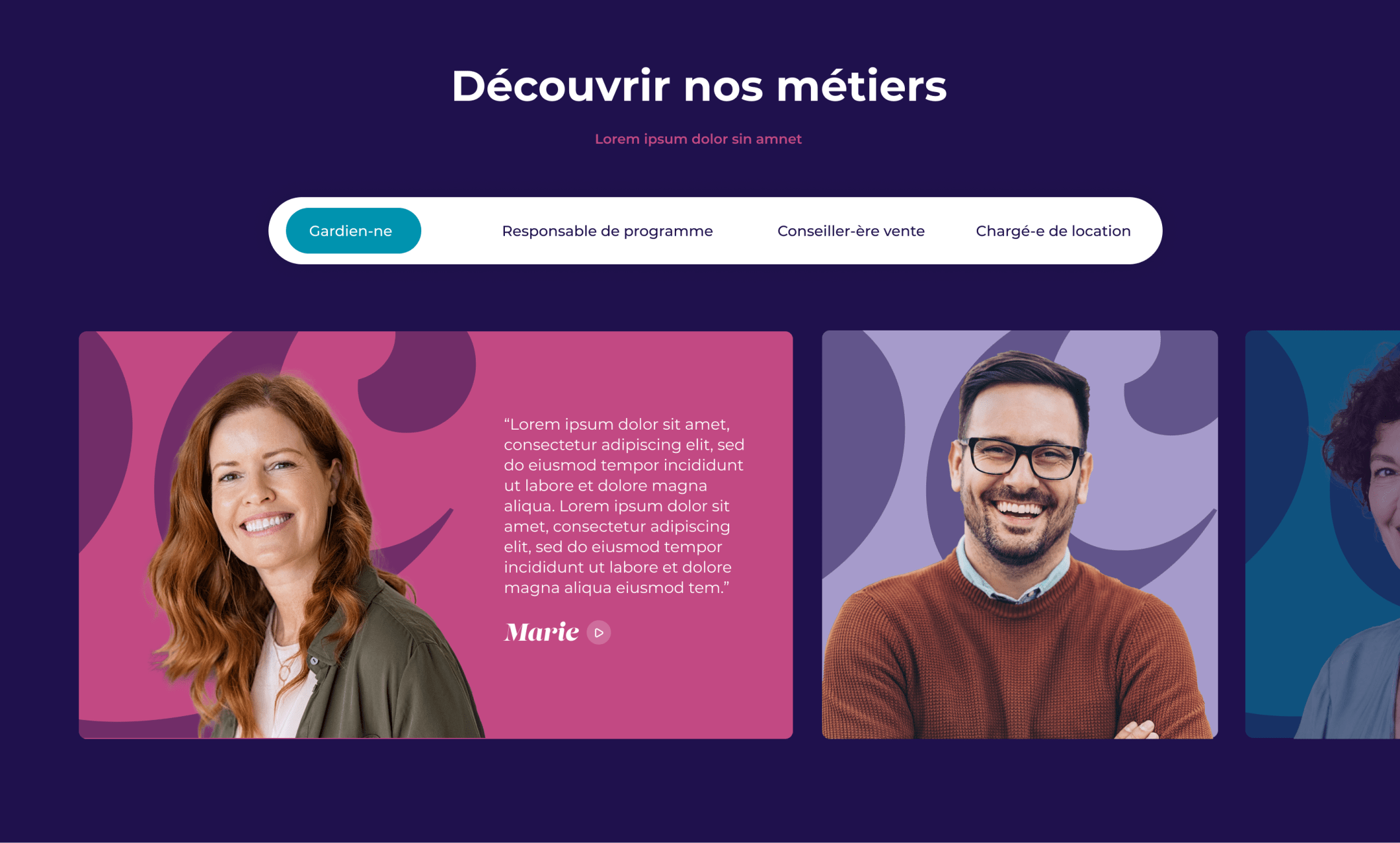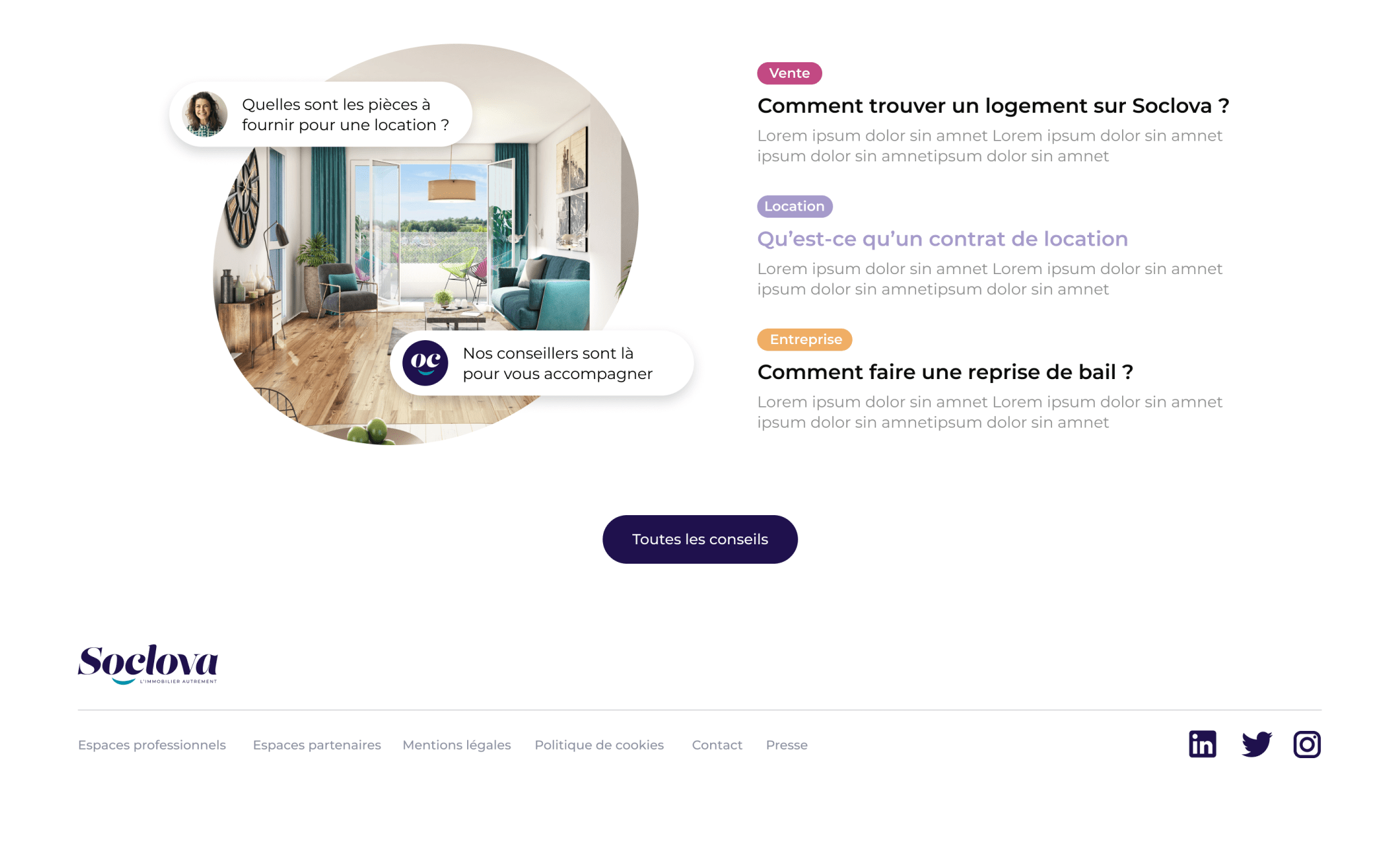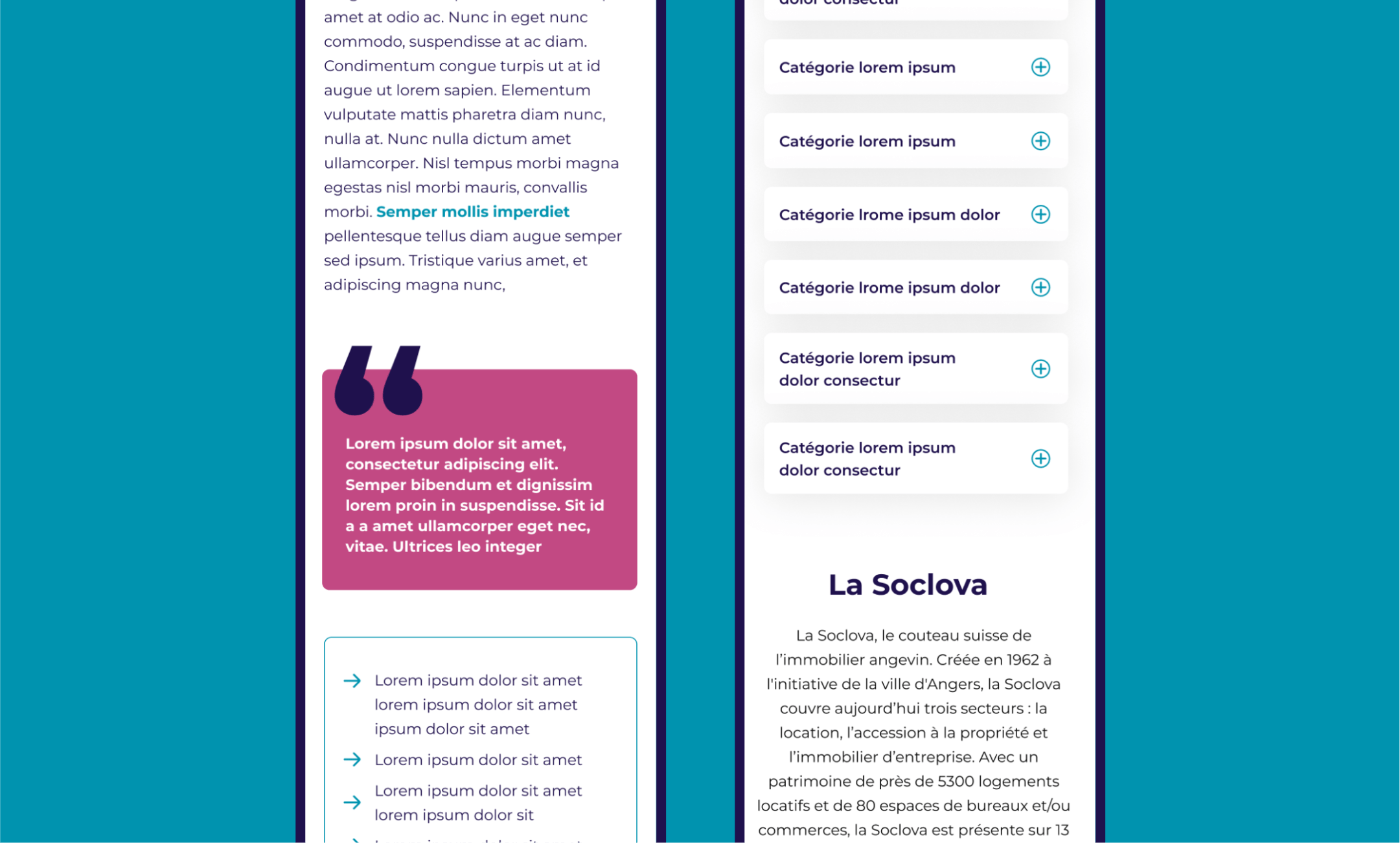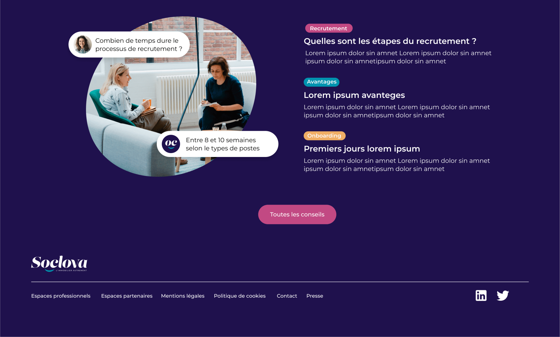 Notre direction artistique était en partie pilotée par les nouveaux codes de la nouvelle charte graphique de la Soclova créée par “Ça Claque”, Blandine Libaud. Nous avons pu travailler sereinement cette phase d’UI Design grâce à la matière que nous avons pu recenser avec l’atelier contenu.