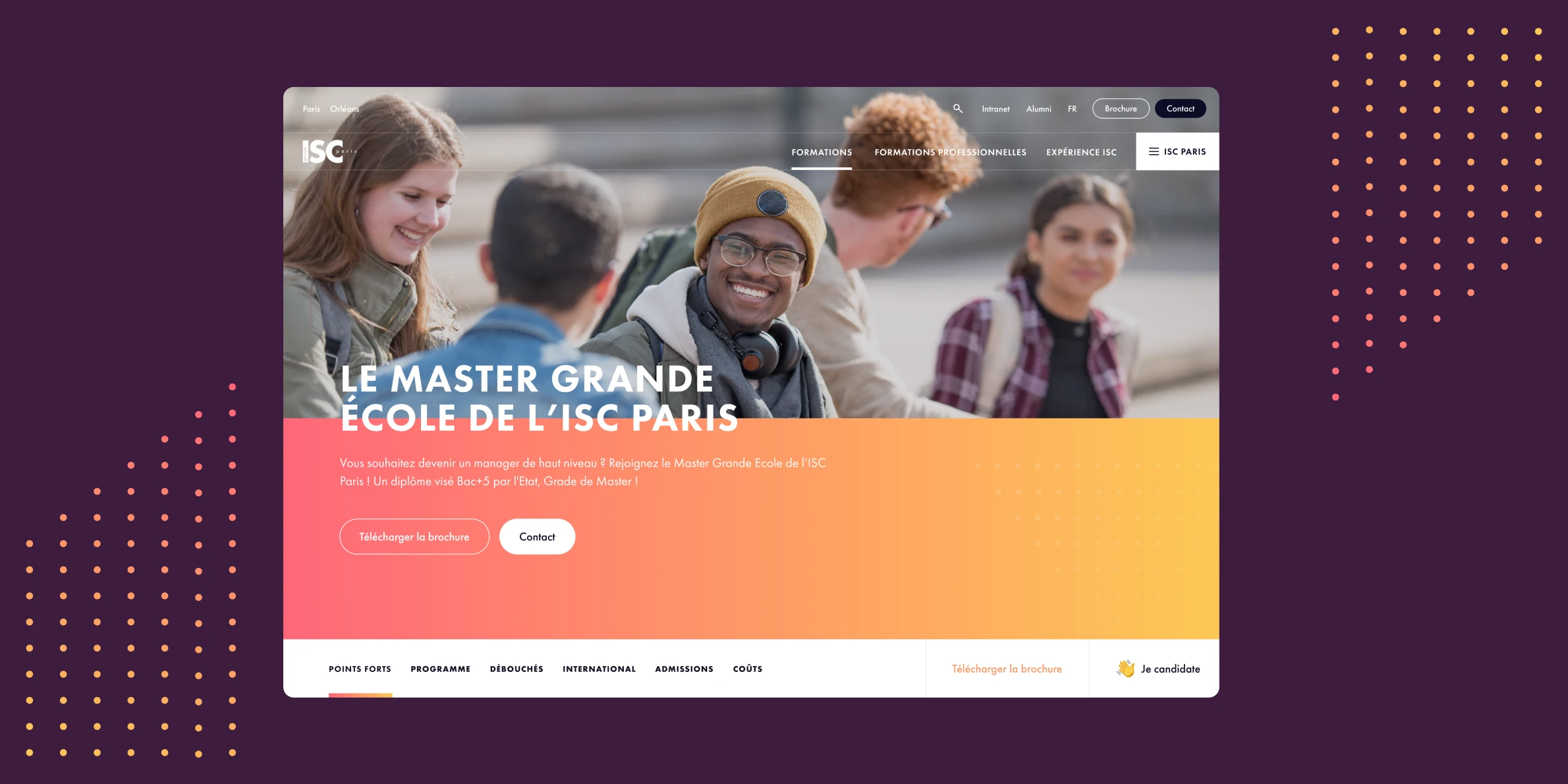 L’UI Design se veut immersive et impactante à travers les différentes nuances de couleurs dédiées à chacune des briques de formations afin d’avoir une expérience utilisateur cohérente. Des grosses typographies viennent rythmer les pages, des patterns en pointillés sont également présents pour rappeler la charte de l’ISC Paris et permettent de mettre en valeur les images du site web. Concernant l’iconographie, l’humain est au cœur du site web, et des photos d’étudiants sont présentes tout au long du parcours afin d’incarner au mieux l’école.