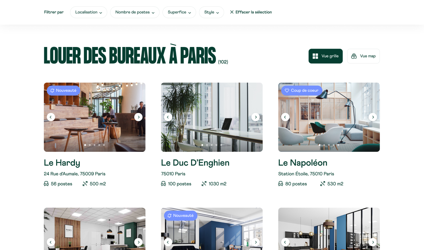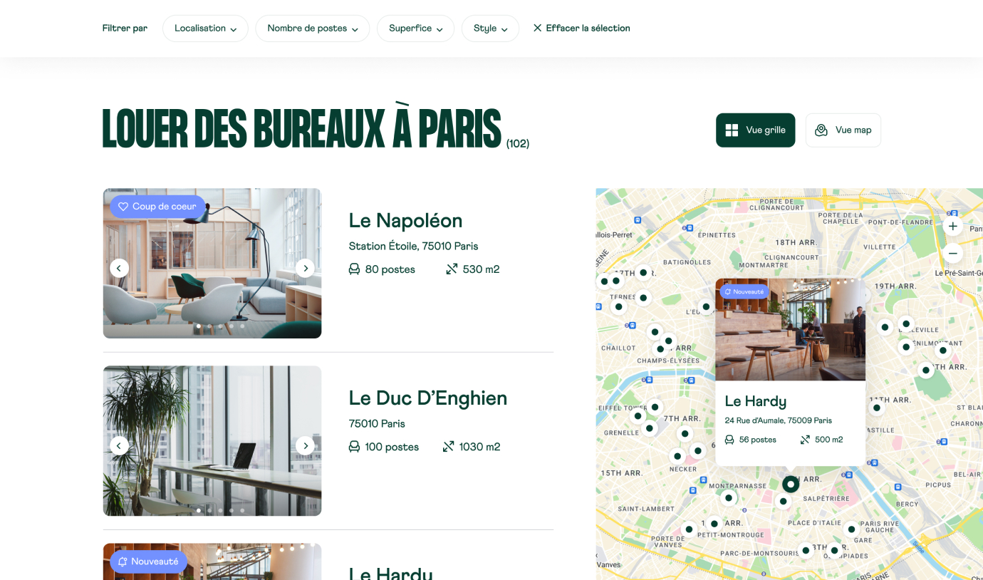 Pour la page de liste des espaces nous avons cherché des moyens de faciliter au maximum la recherche d’un espace pertinent pour l’utilisateur. Cela passe par des filtres, une vue map, différents points de contact (contact, créer une alerte)