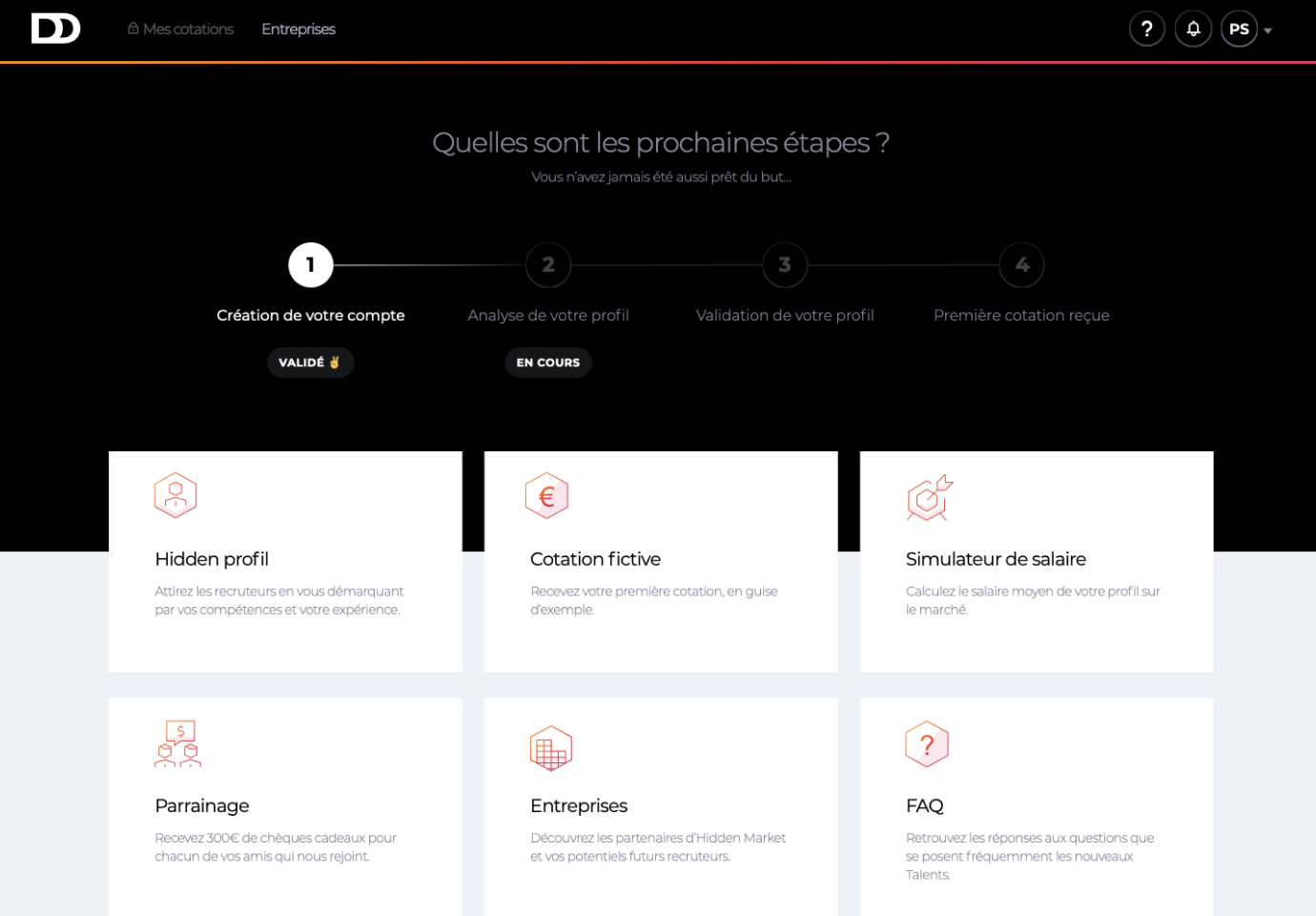 Au vu de ce constat, Hidden Market a mis en place une plateforme reprenant les caractéristiques d’une place de marché équitable. Les talents sont alors évalués selon leur valeur intrinsèque, tout en gardant leur anonymat et sans sur-sollicitation.