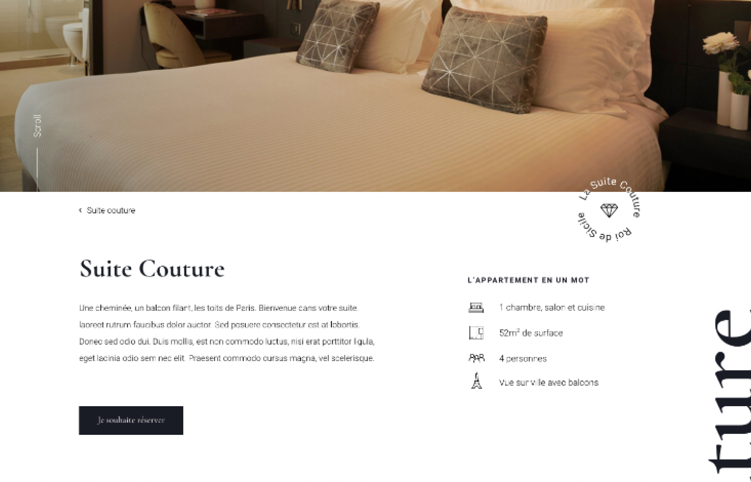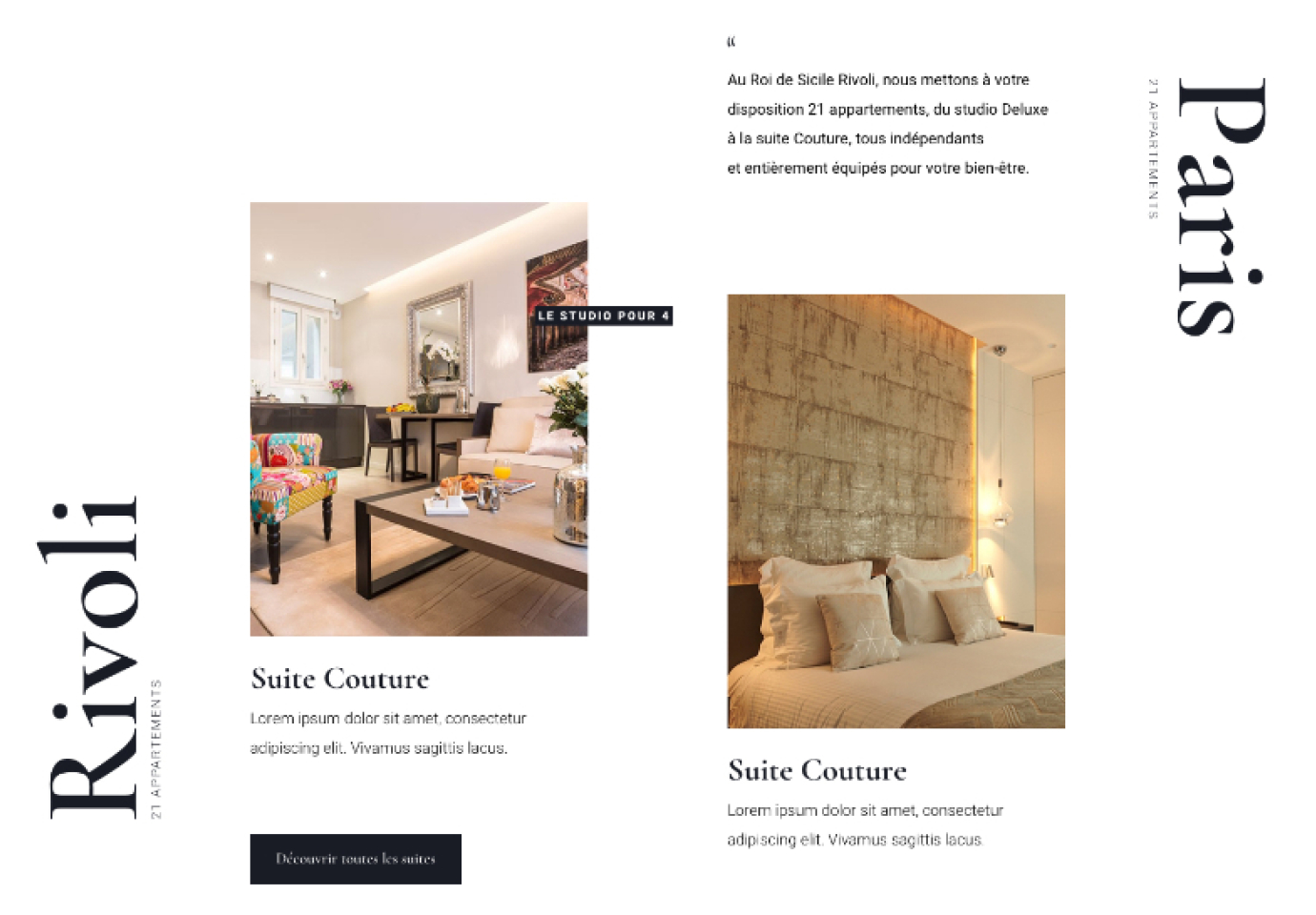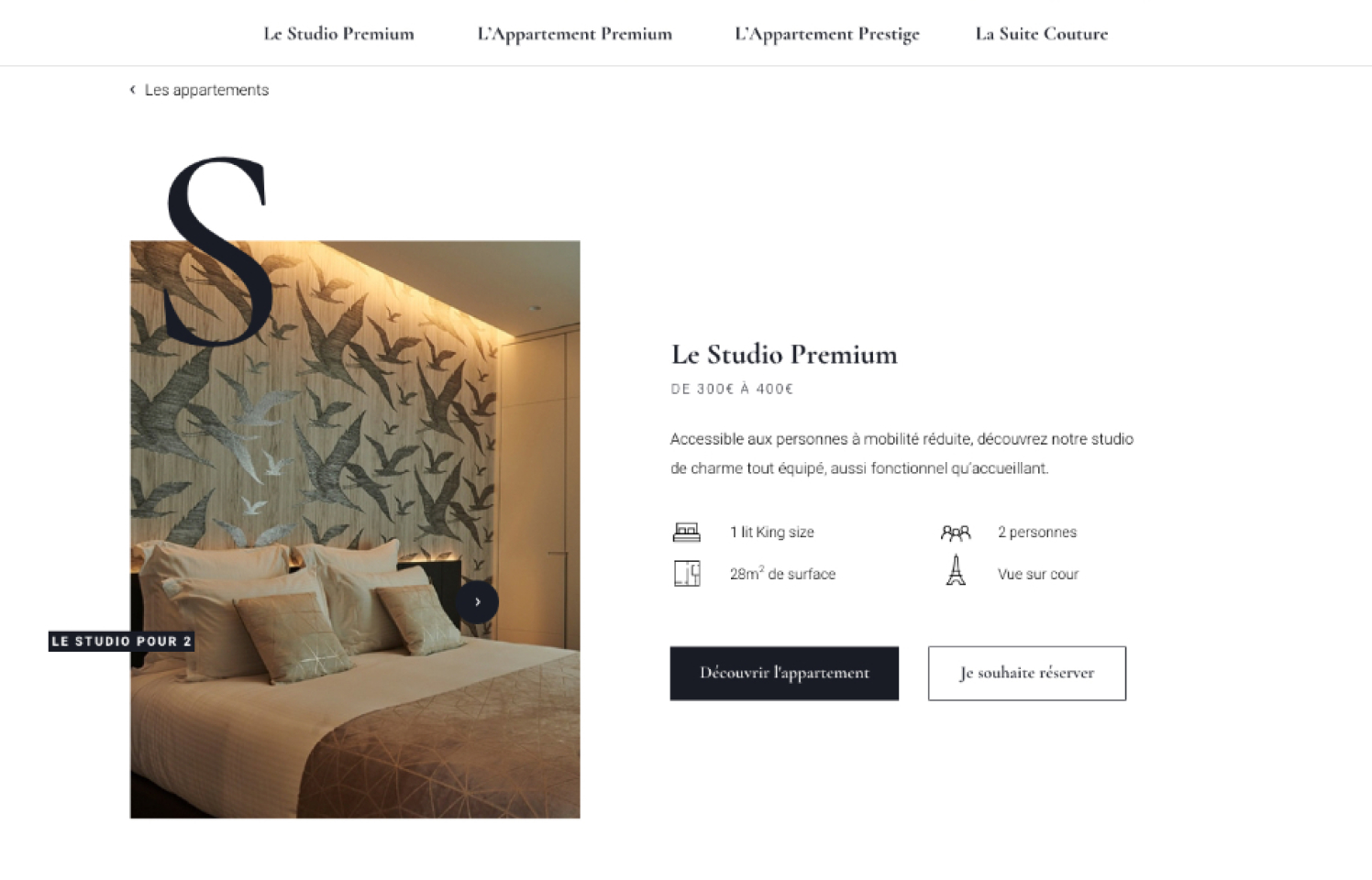Un outil multi-site permettant de centraliser tous les sites des hôtels dans une même interface de gestion. Un template de site hôtel a été pensé pour être dupliqué dès que de nouveaux lieux ouvriront avec des parcours utilisateurs dédiés et créés par rapport aux besoins de la cible.