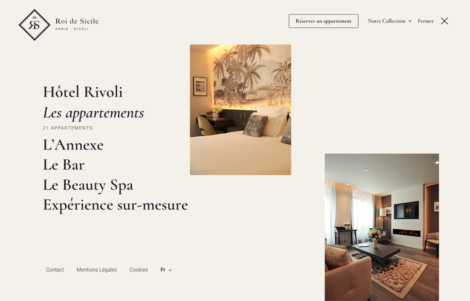 Un site groupe Roi de Sicile Collection qui présente le concept du groupe et permet d’accéder aux différents sites des hôtels.