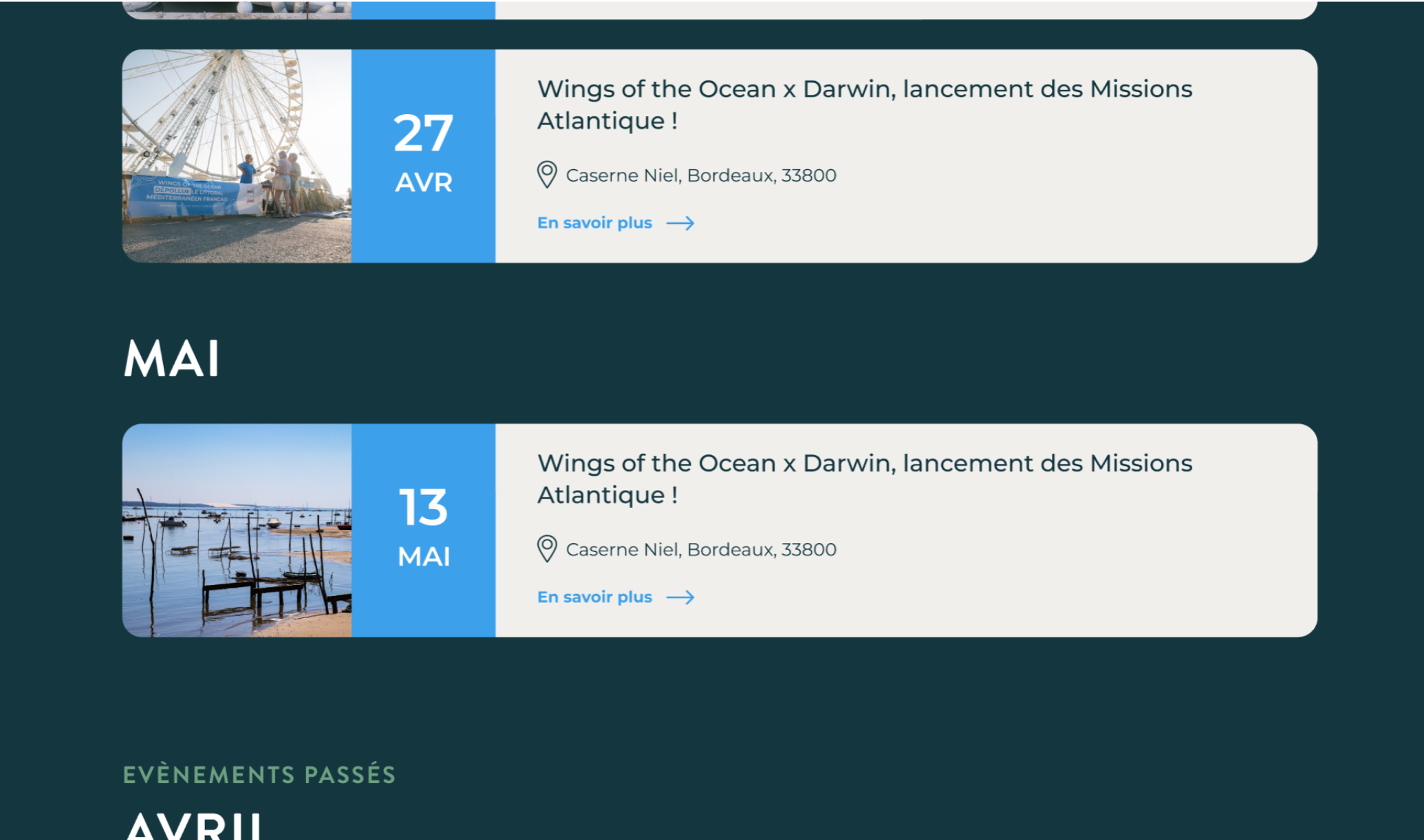 En séance, l’équipe Wings of The Ocean a été immédiatement réactif et a validé l’arborescence. Nos entrées de navigation sont simples et efficaces pour l’utilisateur : “nos missions” , “Label”, « Partenaires » “Événements” “Actualités” et deux boutons “nous rejoindre”, “faire un don “ pour inciter l’engagement.