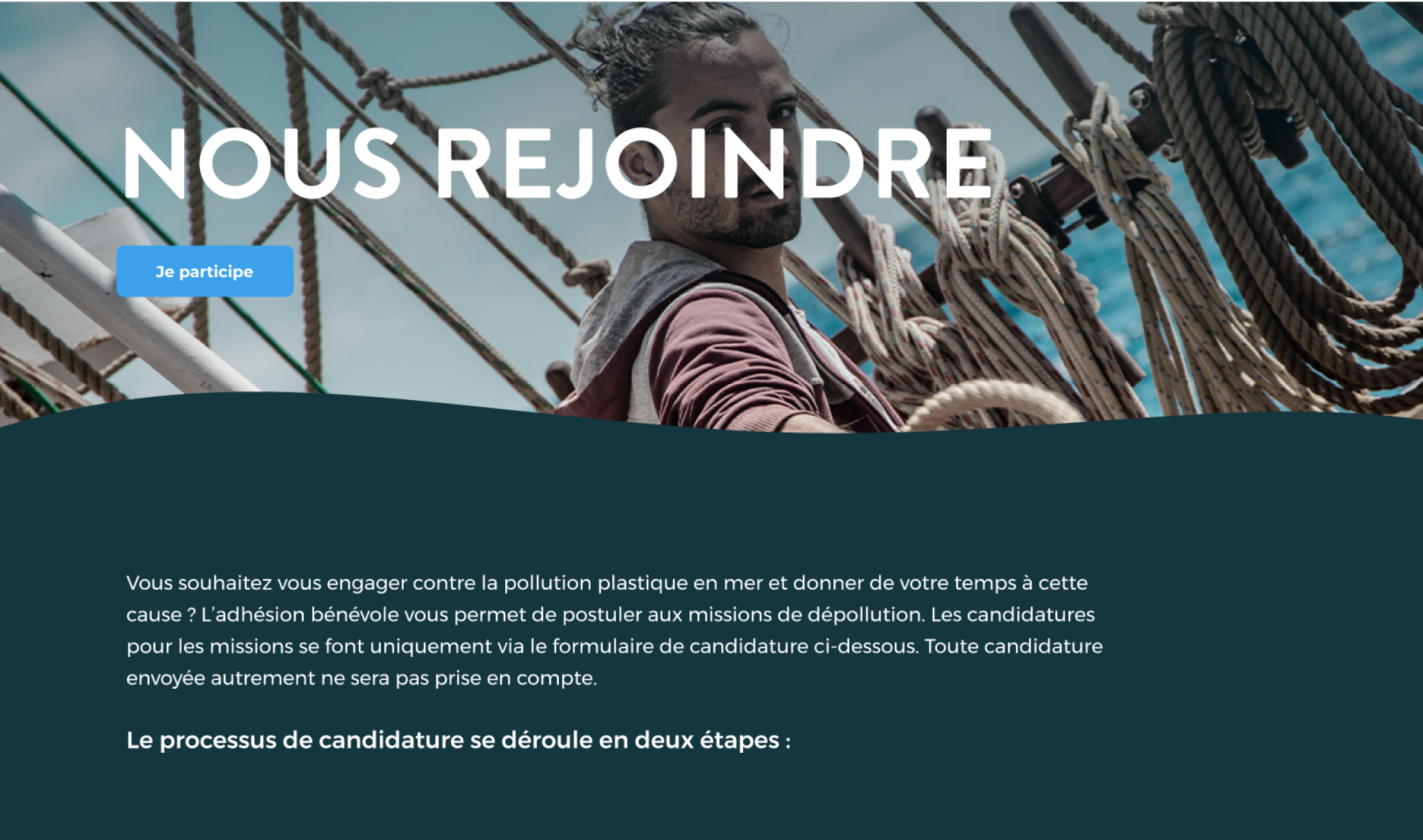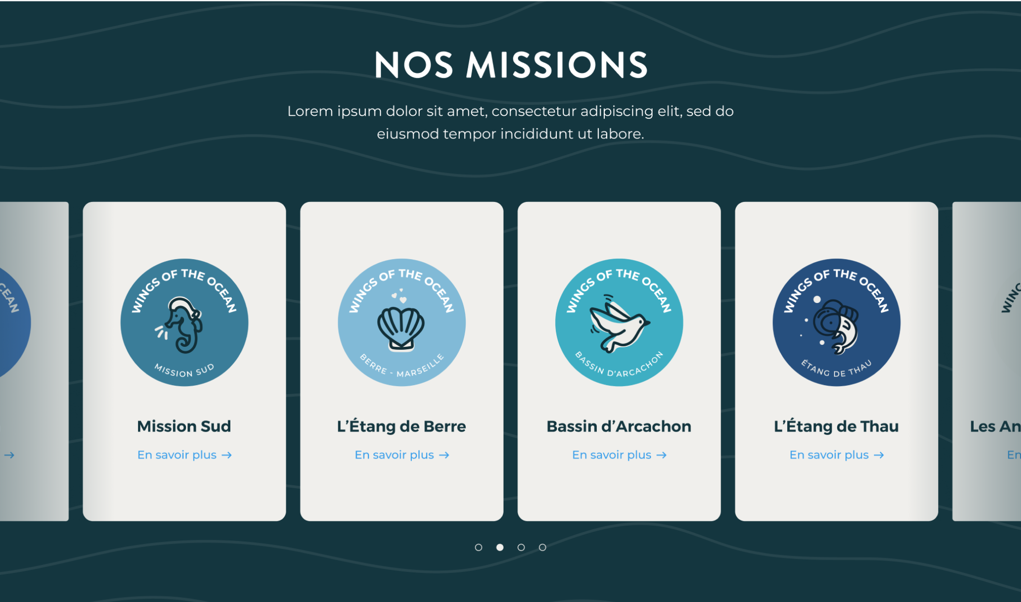 L’UI design se veut immersive et impactante à travers leurs couleurs et les pictogrammes dédiés à chacune des missions. Tout le long du site, l’aspect de la vague est présent en header et footer ou encore au niveau des images pour rappeler la charte graphique et les valeurs de Wings of the Ocean. Ils ont fait le choix d’avoir un site plutôt sombre que clair.
