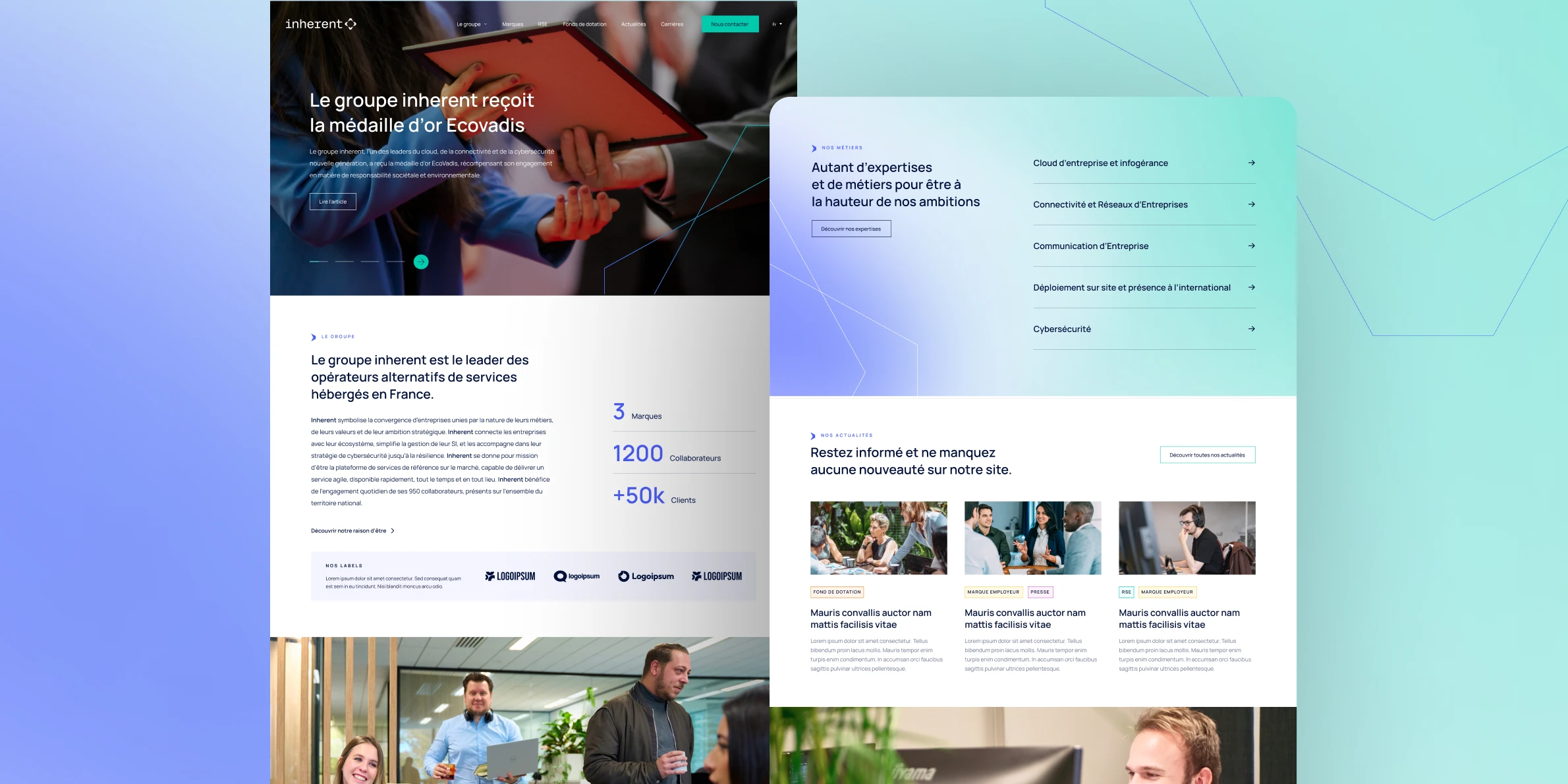 Dans le cadre de notre partenariat avec l’agence 4uatre qui a travaillé sur l’identité, nous avons été consultés par le groupe inherent qui nous a fait part de sa volonté d’avoir une présence rapide sur le digital. En effet, le groupe était prêt à annoncer le plus vite possible, en interne puis à l’externe, la création de la marque ombrelle inherent, qui réunit aujourd’hui 3 marques opérationnelles. Pour faire cette annonce de la meilleure des manières, il avait besoin d’un site internet pour présenter inherent et dévoiler la stratégie globale du groupe.