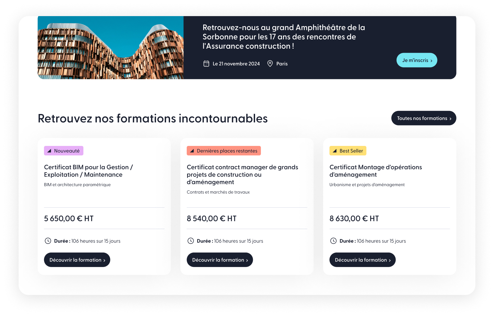 Grâce à un design commun et une navigation optimisée, les utilisateurs accèdent plus facilement aux formations, aux ouvrages et aux modules e-learning, avec une expérience fluide entre les deux sites internet.