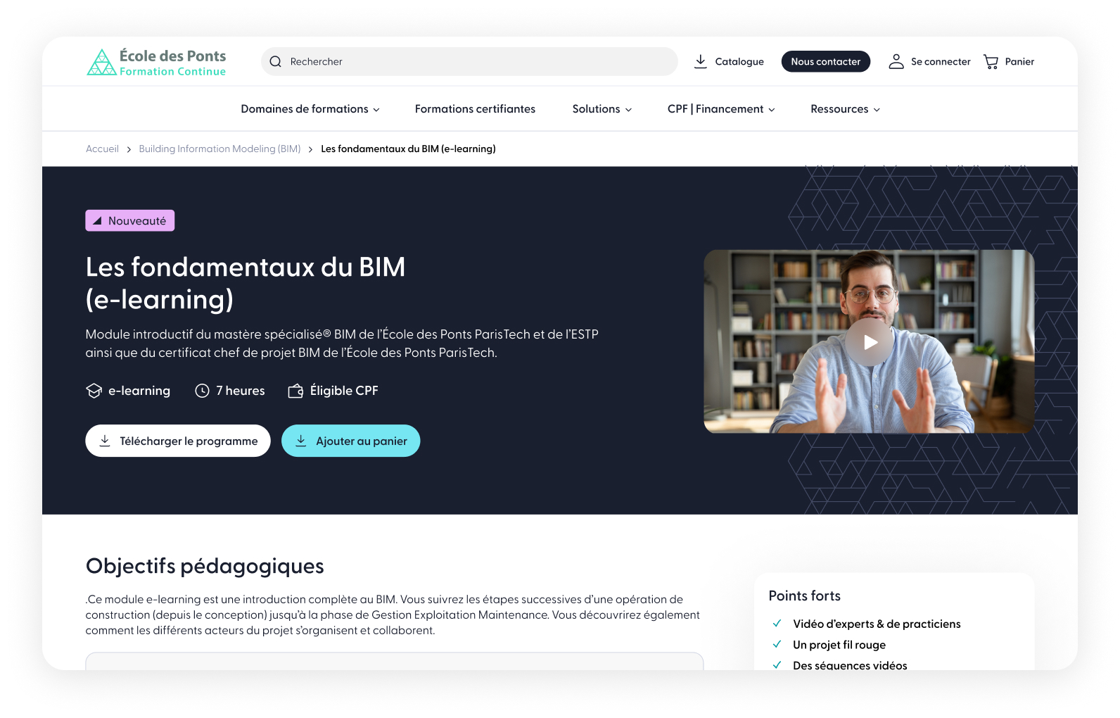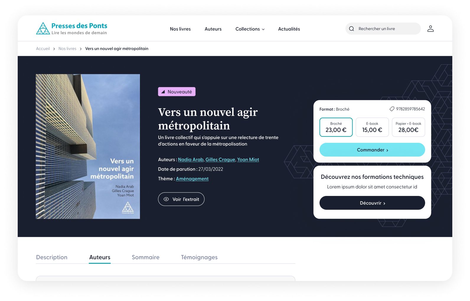 - Côté Presses des Ponts, le site a été repensé comme une vitrine produit claire et éditorialisée, valorisant chaque ouvrage avec des contenus enrichis (descriptions, extraits, auteurs). La gestion e-commerce (panier, paiement, livraison) est gérée sur le site Ponts Formation Continue. Ce choix stratégique permet de :- Mutualiser les efforts de maintenance et d’optimisation e-commerce,