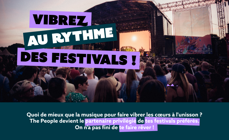 Nous avons développé une page dédiée aux festivals pour valoriser les différents partenariats notamment avec We Love Green en juin 2024. Cette page permet de mettre en avant les offres et les packs disponibles dans le cadre du partenariats (nuits d’hôtels + entrées au festival par exemple). L’agence 4uatre a travaillé sur le design d’un stand au We Love Green festival permettant d’accroître la visibilité de marque The People.
