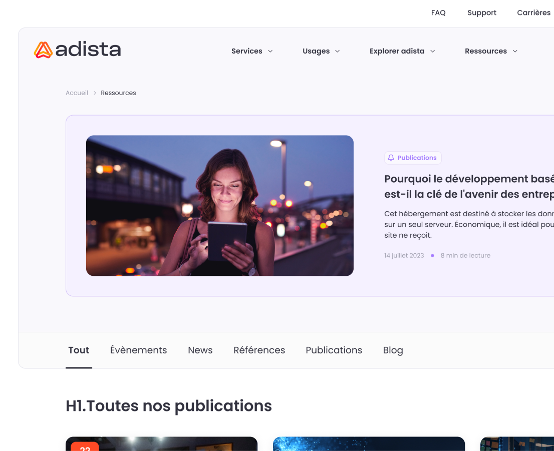 La refonte du site d’adista représente bien plus qu’une simple refonte graphique. Au-delà du design, un travail approfondi a été effectué sur les contenus pour les rendre plus accessibles et pertinents pour les utilisateurs. Nous avons cherché à créer des textes qui captivent et guident les utilisateurs tout en répondant aux exigences des moteurs de recherche pour améliorer notre visibilité en ligne (en savoir plus sur le SXO). Cette démarche stratégique vise à attirer un trafic qualifié et à augmenter la génération de leads.