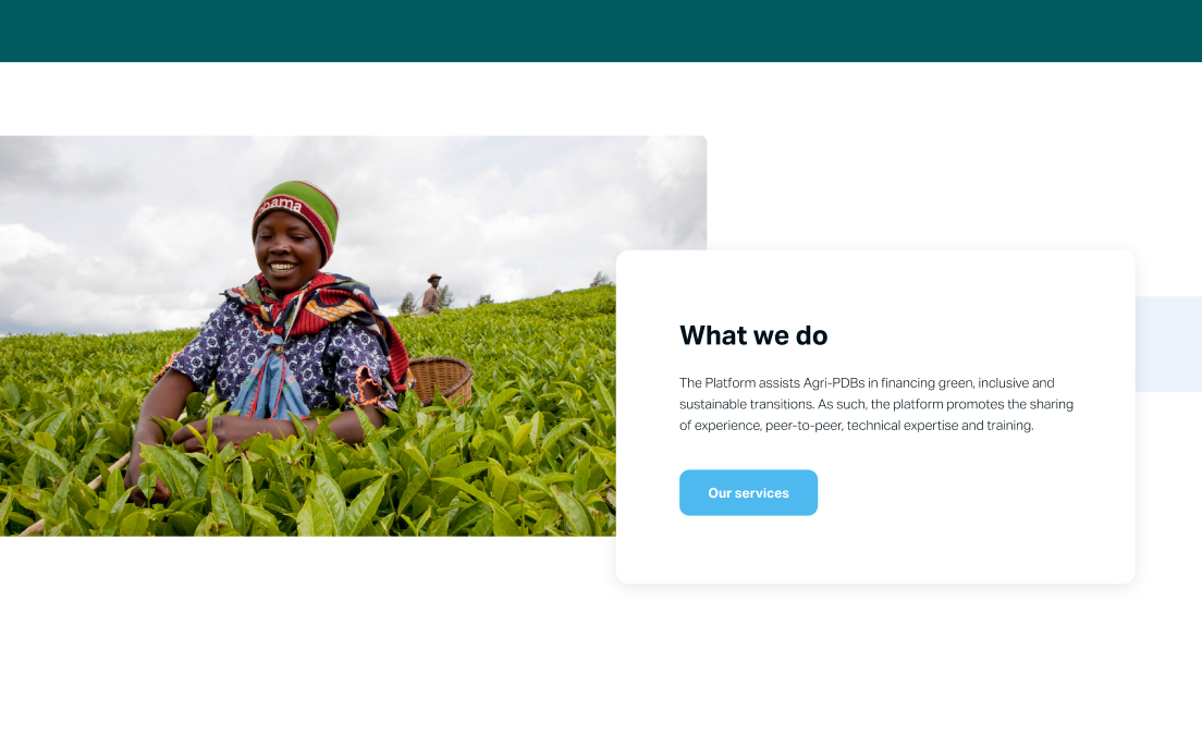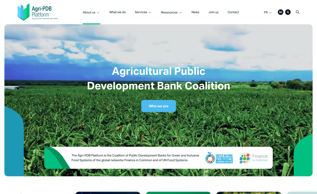 La plateforme des Banques de Développement Agricole pour des Systèmes Alimentaires Verts et Inclusifs (Agri-PDB | Platform) est hébergée par le Fonds International de Développement Agricole (FIDA) en partenariat avec l’Agence Française de Développement (AFD). Par ailleurs, la plateforme fait partie de l’initiative Finance in common et du centre de coordination de l’UNFS.