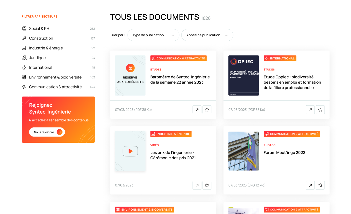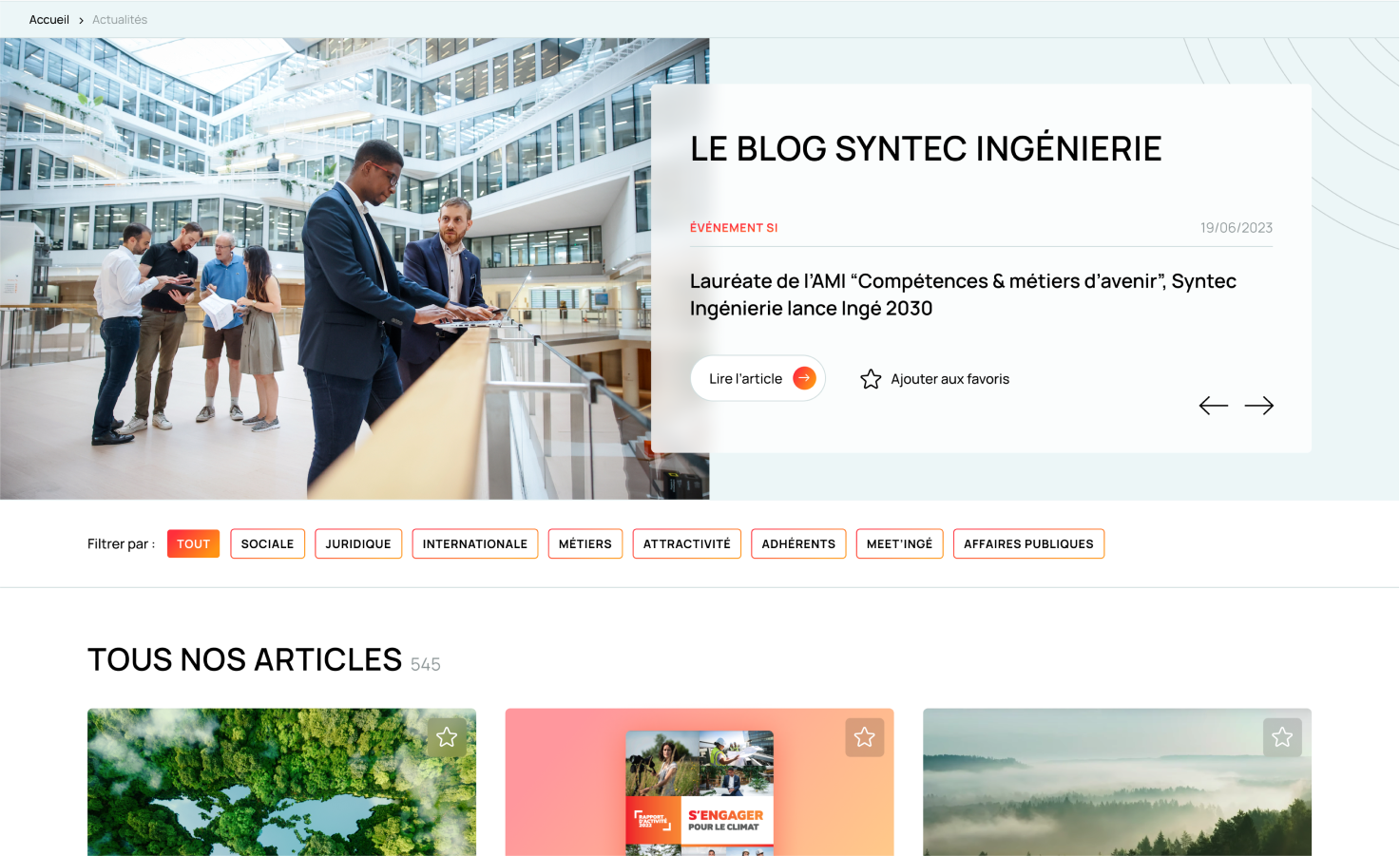 Pour finir l’utilisateur est toujours au centre de nos réflexions et pour cette refonte, nous avons avec Syntec-Ingénierie l’objectif de fournir un extranet personnalité aux adhérents dans lequel ils pourront retrouver les dernières publications publiées par les équipes, de consulter des documents spécifiques. De plus, ils ont aussi la possibilité d’ajouter en favori des actualités ainsi que de retrouver facilement les évènements auxquels ils ont ou vont participer prochainement. Il s’agit d’un tout nouvel espace qui évoluera sans aucun doute dans le temps en fonction de leur nouveau besoin.
