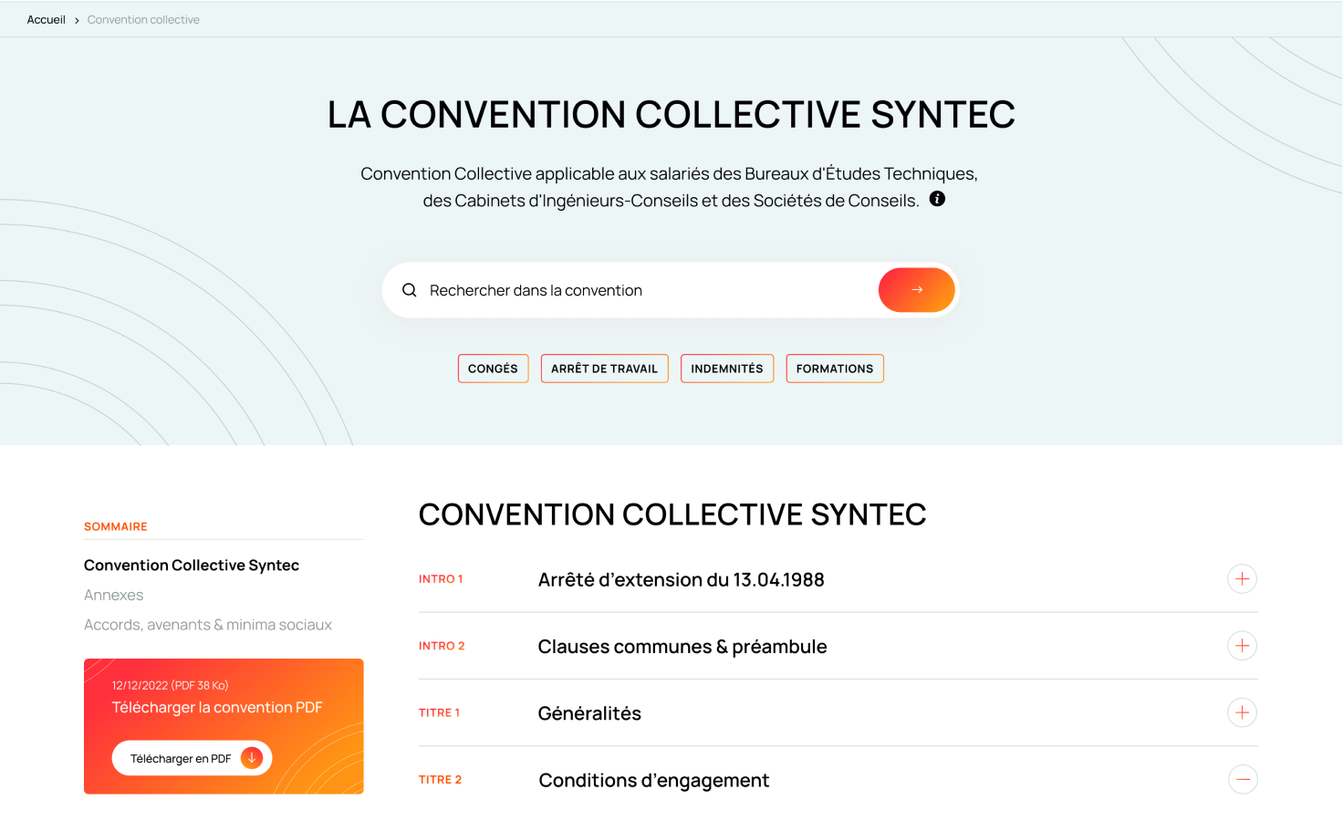 Le quatrième chantier a été de retravailler des fonctionnalités existantes telles que la convention collective et l’espace documentaire. Pour ces éléments, nous sommes un exercice d’optimisation et de clarté. Ce sont des pages denses avec du contenu légal pour le premier, notre tâche a été de maximiser l’expérience utilisateur en ajoutant des principes de suggestion, un ajout de moteur de recherche spécifique pour ces pages et la présence de filtres par secteur et type de document.