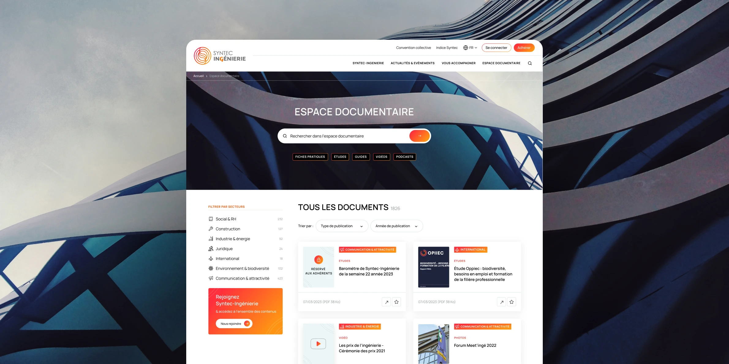 Il doit aussi répondre à des enjeux de communication et de recrutement : le contenu exposé sur le site doit permettre de qualifier les prises de contact et d’améliorer l’acquisition de nouveaux adhérents. L’expérience visuelle doit également permettre aux internautes de reconnaître au premier coup d’œil la marque Syntec-Ingénierie.